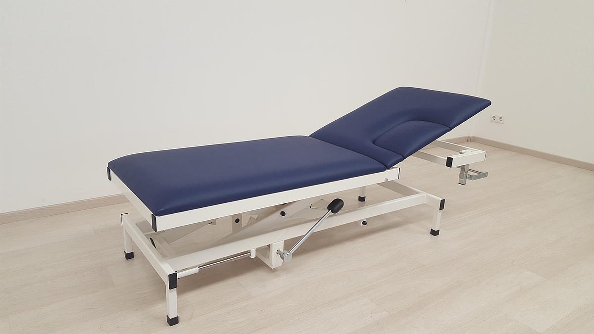 - Die Hydraulik wird durch die eingebaute Fußpumpe bedient. Die Höhenverstellung kann natürlich auch mit schweren Patienten (bis 200 kg), ohne größeren Kraftaufwand, erfolgen. Um die Hydraulik von beiden Seiten betätigen zu können, ist die Montage eines weiteren Fußhebels möglich. Dieser ist gegen Aufpreis (Bestell-Nr.: FPH-10) erhältlich.