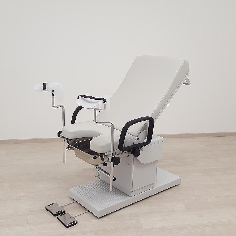 Darstellung der parallel mitgeführten Kreiselspüle, Bestell-Nr.: KS-2000, bei der elektromotorischen Beckenhochlagerung des urologischen Untersuchungsstuhls, Bestell-Nr.: UUS-3060/EEE. Hier wird selbst ein hoher Spritzschutz in der obersten Position gewährleistet.
